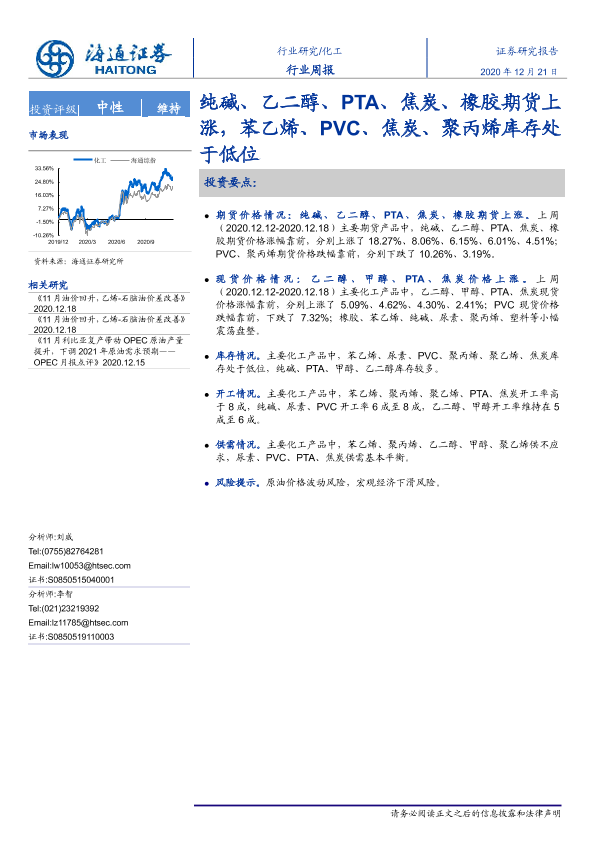 【海通证券】【20201221】20201221-海通证券-化工行业周报:纯碱、乙二醇、PTA、焦炭、橡胶期货上涨,苯乙烯、PVC、焦炭、聚丙烯库存处于低位-11页