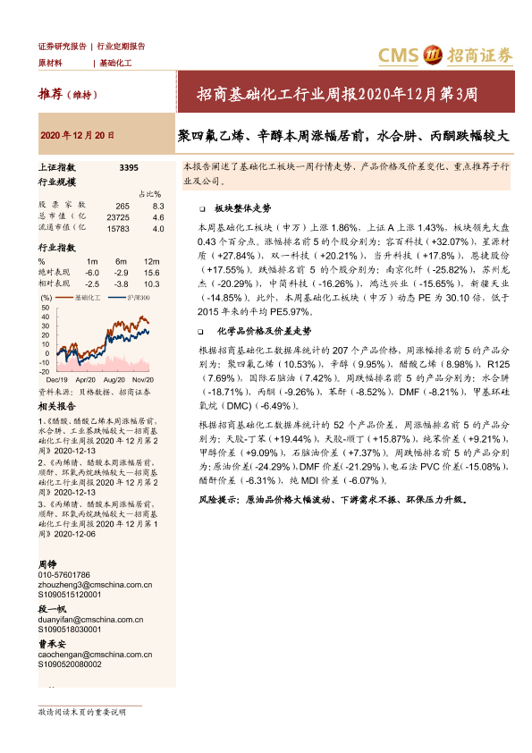 【海通证券】【20201220】招商基础化工行业周报2020年12月第3周:聚四氟乙烯、辛醇本周涨幅居前,水合肼、丙酮跌幅较大-25页