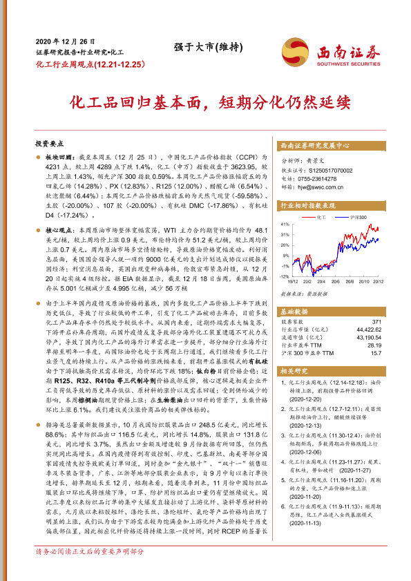 【西南证券】【20201226】20201226-西南证券-化工行业周观点:化工品回归基本面,短期分化仍然延续-13页