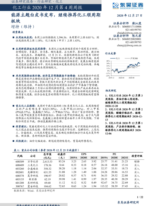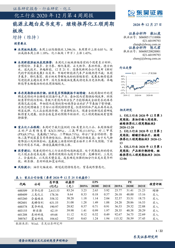 【东吴证券】【20201227】化工行业2020年12月第4周周报:能源主题白皮书发布,继续推荐化工顺周期板块-22页