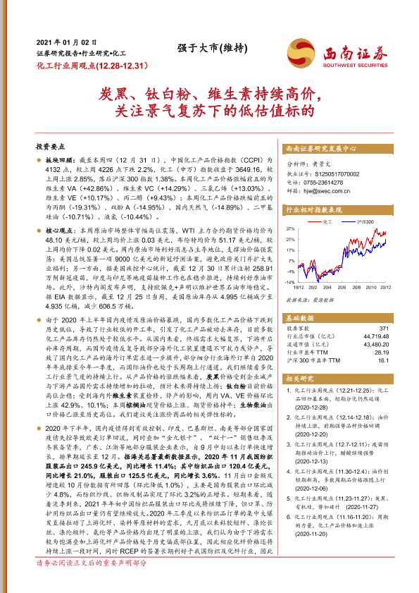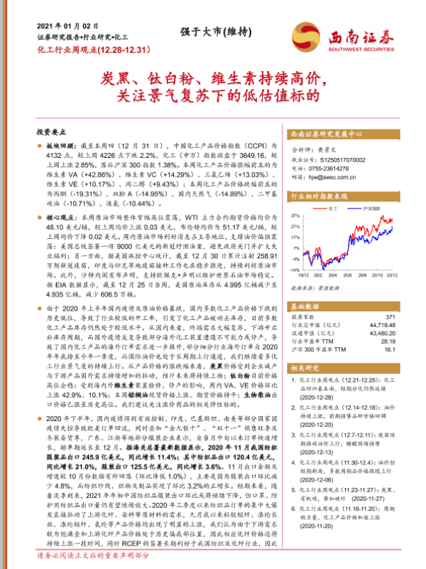 【西南证券】【20210102】20210102-西南证券-化工行业周观点:炭黑、钛白粉、维生素持续高价,关注景气复苏下的低估值标的-15页