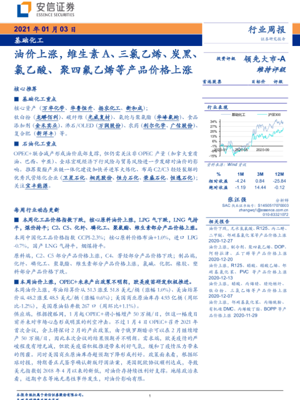【安信证券】【20210103】基础化工行业周报:油价上涨,维生素A、三氯乙烯、炭黑、氯乙酸、聚四氟乙烯等产品价格上涨-4页