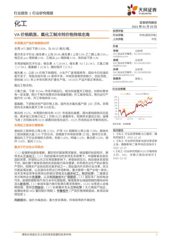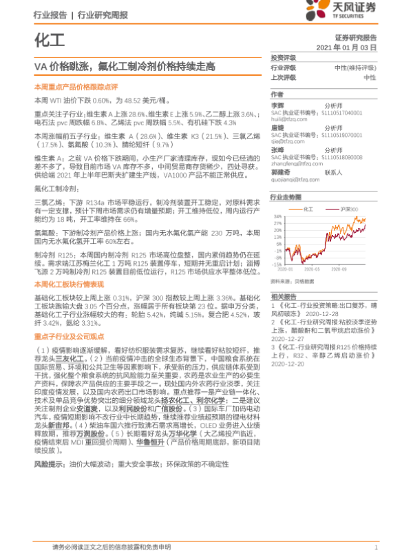 【天风证券】【20210103】20210103-天风证券-化工行业研究周报:VA价格跳涨,氟化工制冷剂价格持续走高-21页