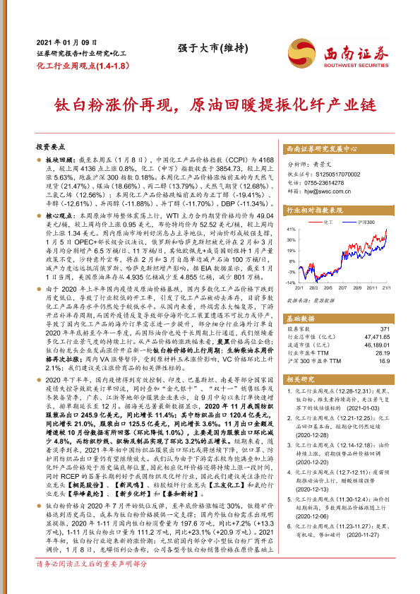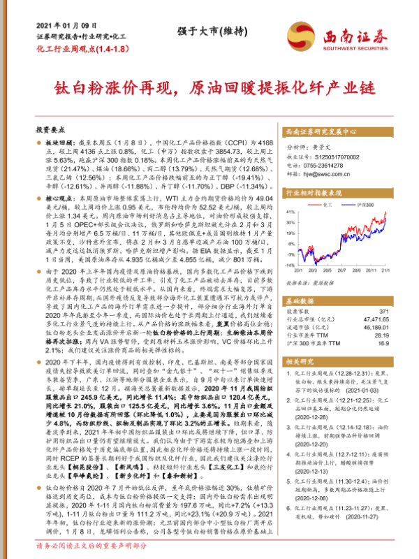 【西南证券】【20210109】20210109-西南证券-化工行业周观点:钛白粉涨价再现,原油回暖提振化纤产业链-15页