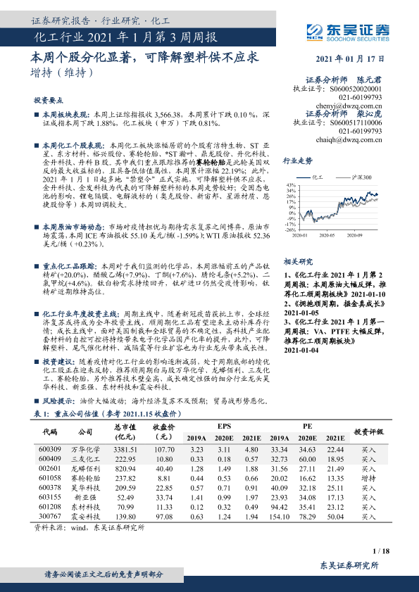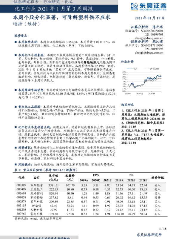 【东吴证券】【20210117】化工行业2021年1月第3周周报:本周个股分化显著,可降解塑料供不应求-18页