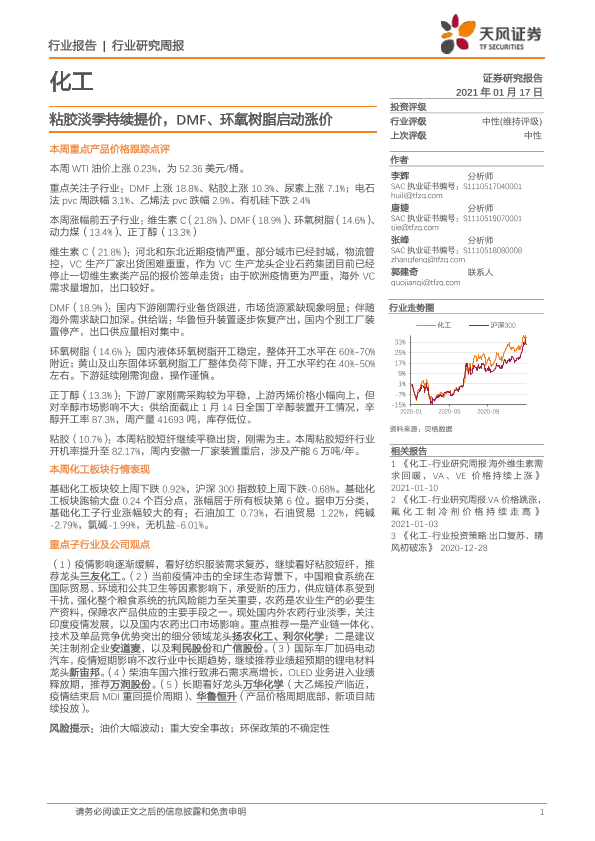 【天风证券】【20210117】化工行业研究周报:粘胶淡季持续提价,DMF、环氧树脂启动涨价-21页