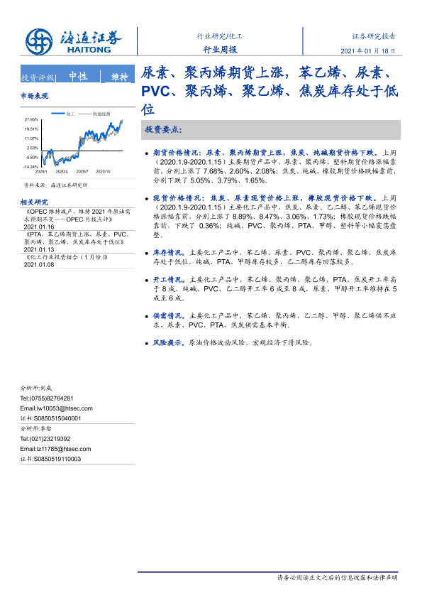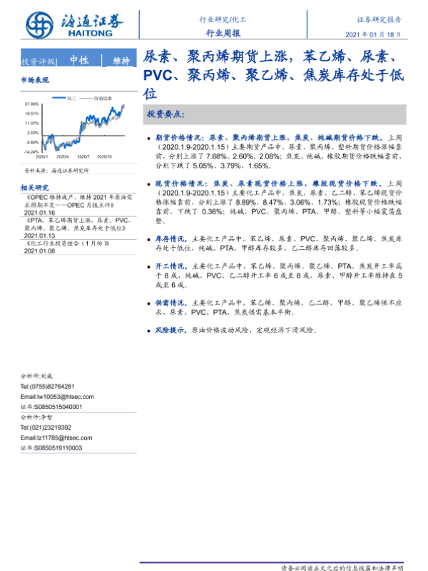 【海通证券】【20210118】20210118-海通证券-化工行业周报:尿素、聚丙烯期货上涨,苯乙烯、尿素、PVC、聚丙烯、聚乙烯、焦炭库存处于低位-12页