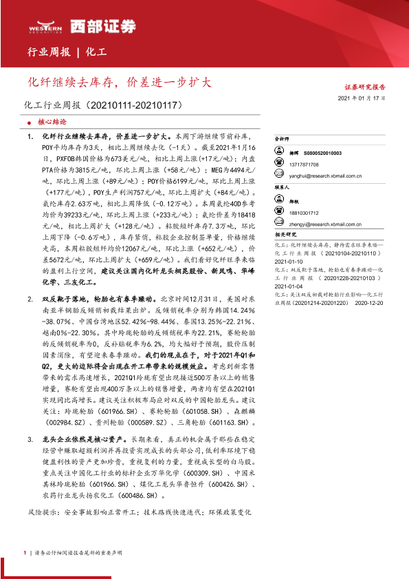 【西部证券】【20210117】化工行业周报:化纤继续去库存,价差进一步扩大-29页