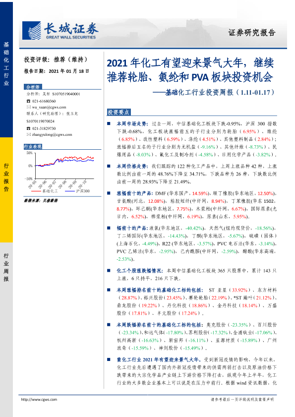 【长城证券】【20210118】20210118-长城证券-基础化工行业投资周报:2021年化工有望迎来景气大年,继续推荐轮胎、氨纶和PVA板块投资机会-26页