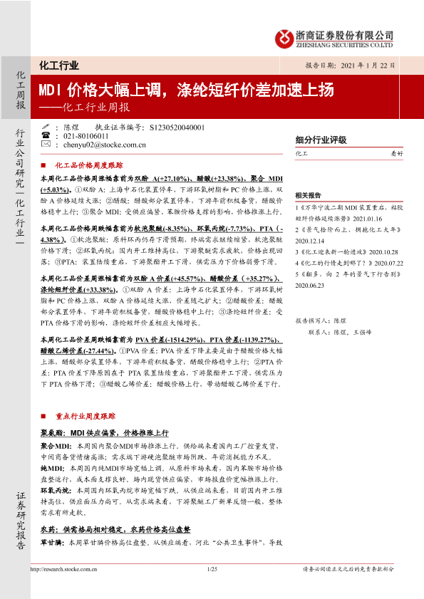 【浙商证券】【20210122】20210122-浙商证券-化工行业周报:MDI价格大幅上调,涤纶短纤价差加速上扬-25页