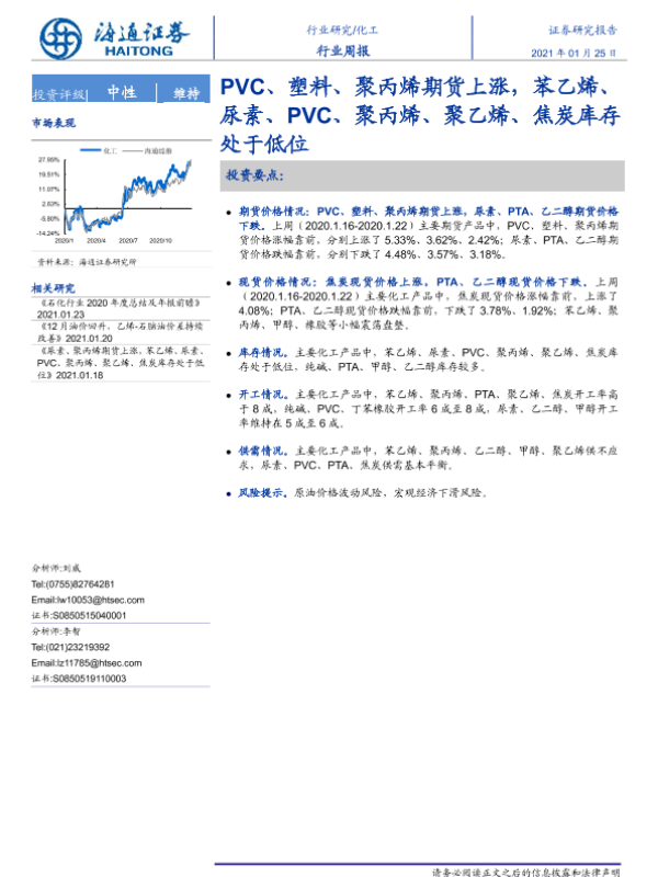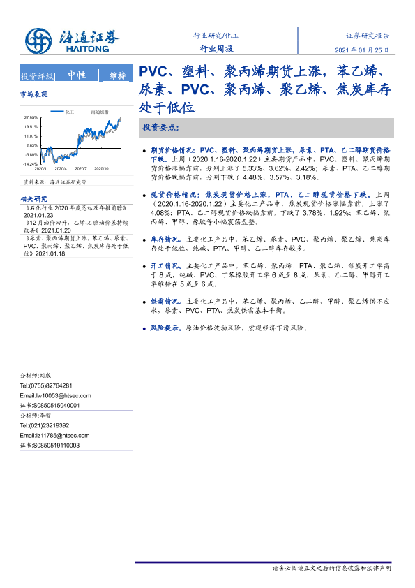 【海通证券】【20210125】20210125-海通证券-化工行业周报:PVC、塑料、聚丙烯期货上涨,苯乙烯、尿素、PVC、聚丙烯、聚乙烯、焦炭库存处于低位-12页