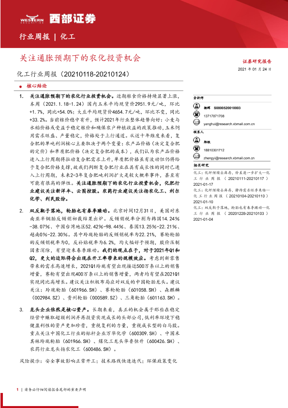 【西部证券】【20210124】20210124-西部证券-化工行业周报:关注通胀预期下的农化投资机会-29页