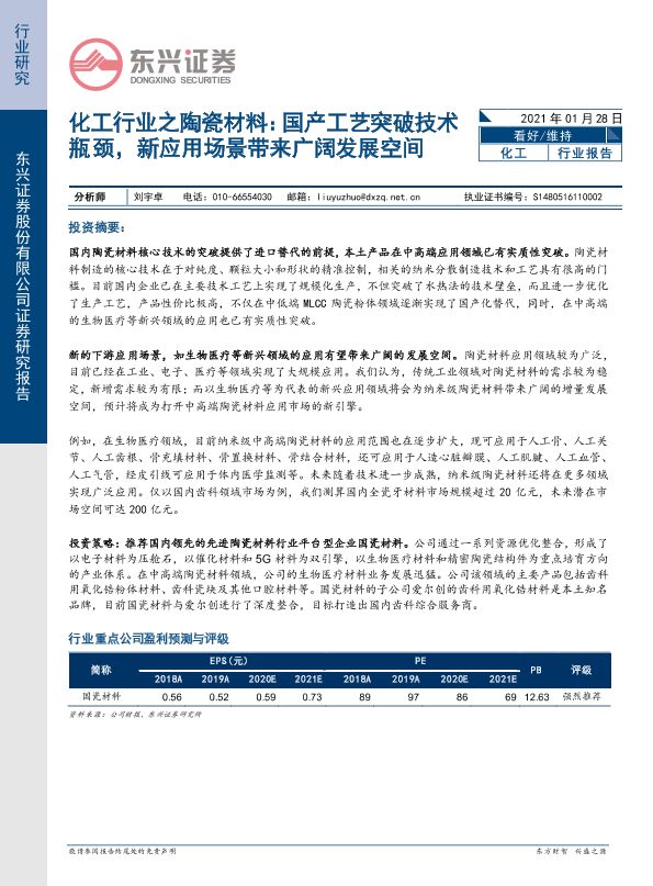 【东兴证券】【20210128】化工行业之陶瓷材料:国产工艺突破技术瓶颈,新应用场景带来广阔发展空间-9页