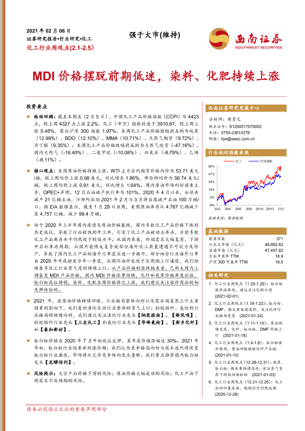 【西南证券】【20210206】20210206-西南证券-化工行业周观点:MDI价格摆脱前期低迷,染料、化肥持续上涨-13页