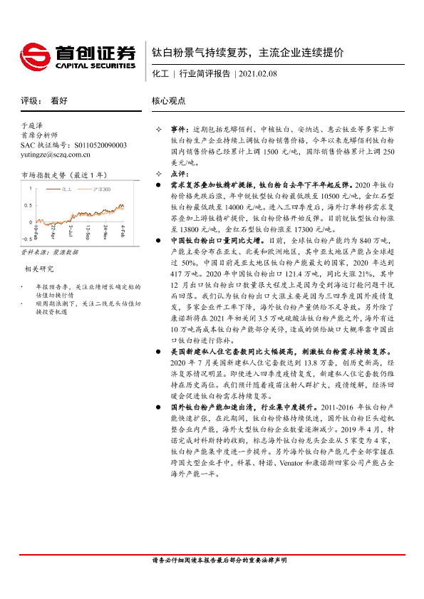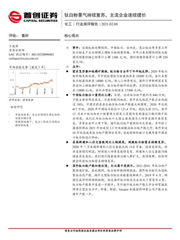 【首创证券】【20210208】20210208-首创证券-化工行业简评报告:钛白粉景气持续复苏,主流企业连续提价-4页
