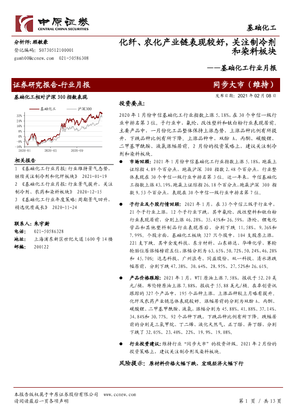 【中原证券】【20210208】基础化工行业月报:化纤、农化产业链表现较好,关注制冷剂和染料板块-13页