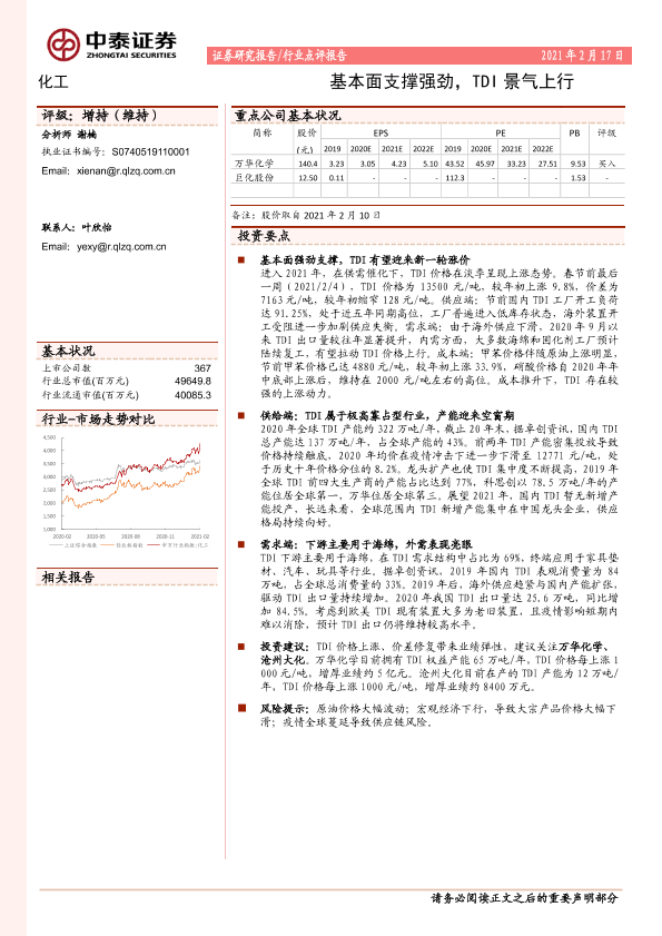 【中泰证券】【20210217】化工:基本面支撑强劲,TDI景气上行-10页