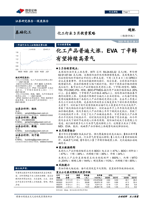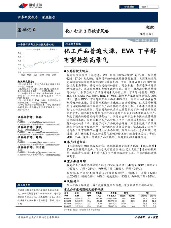 【国信证券】【20210228】化工行业3月投资策略:化工产品普遍大涨,EVA丁辛醇有望持续高景气-15页