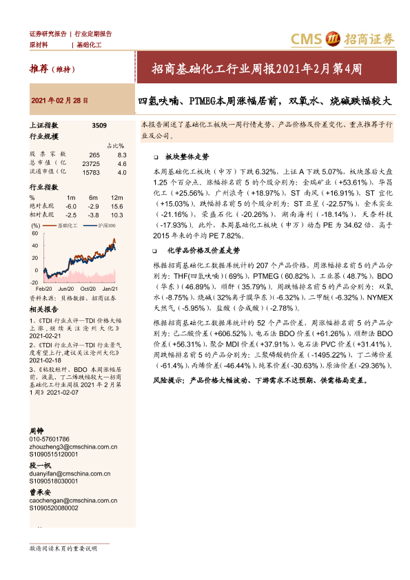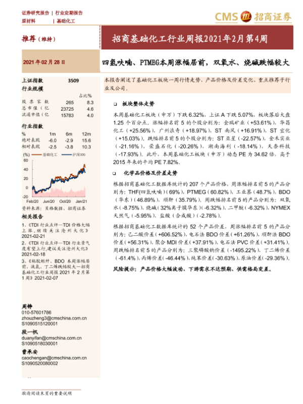 【海通证券】【20210228】基础化工行业周报2021年2月第4周:四氢呋喃、PTMEG本周涨幅居前,双氧水、烧碱跌幅较大-27页