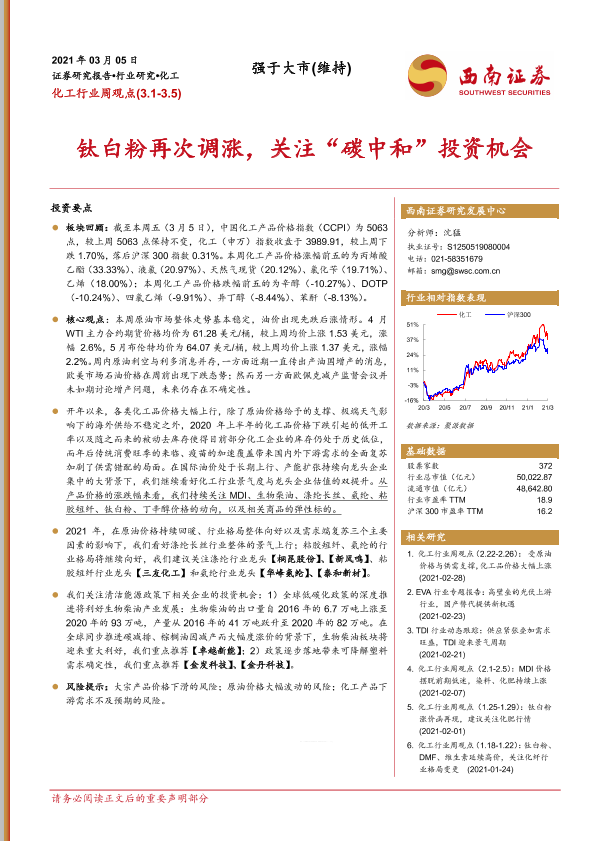 【西南证券】【20210305】20210305-西南证券-化工行业周观点:钛白粉再次调涨,关注“碳中和”投资机会-13页