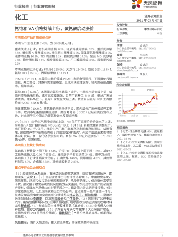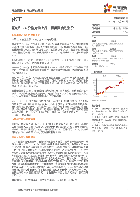 【天风证券】【20210307】20210307-天风证券-化工行业研究周报:氨纶和VA价格持续上行,蛋氨酸启动涨价-21页