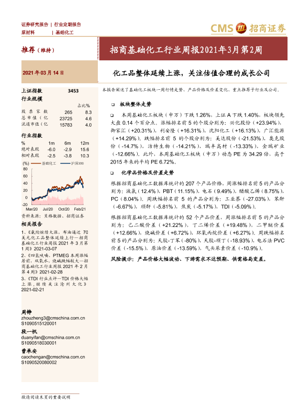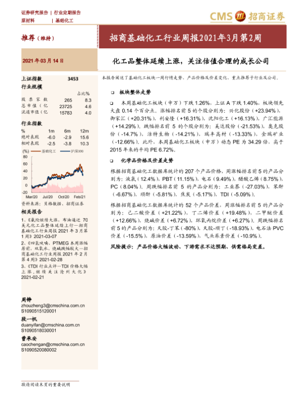 【海通证券】【20210314】基础化工行业周报2021年3月第2周:化工品整体延续上涨,关注估值合理的成长公司-25页