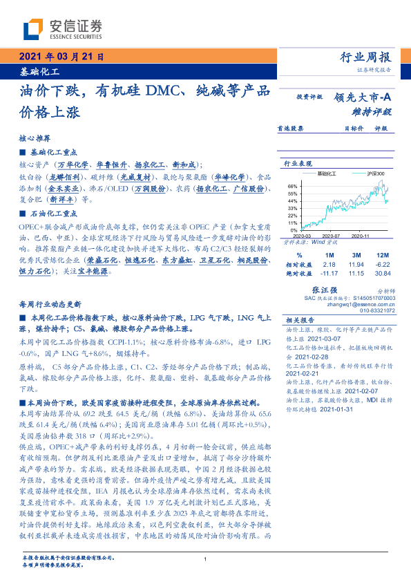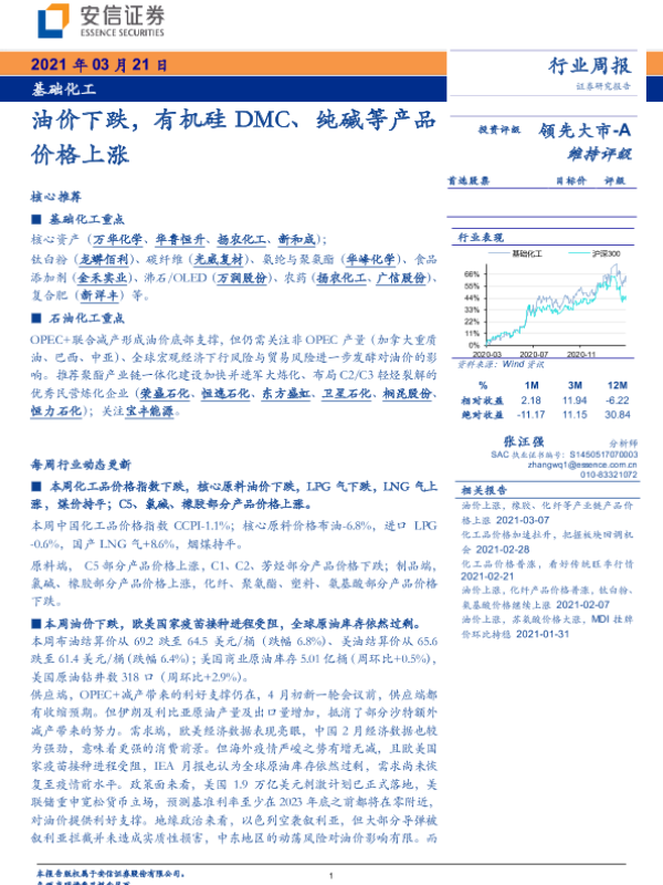 【安信证券】【20210321】基础化工行业周报:油价下跌,有机硅DMC、纯碱等产品价格上涨-4页