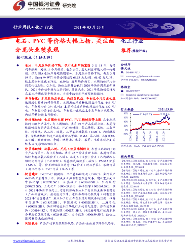 【银河证券】【20210320】20210320-中国银河-化工行业周报:电石、PVC等价格大幅上扬,关注细分龙头业绩表现-17页