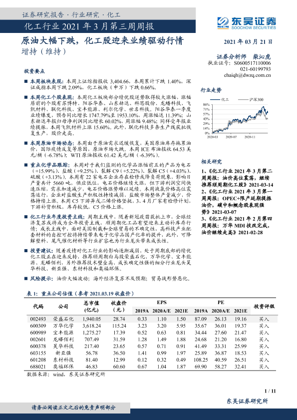【东吴证券】【20210321】化工行业2021年3月第三周周报:原油大幅下跌,化工股迎来业绩驱动行情-11页