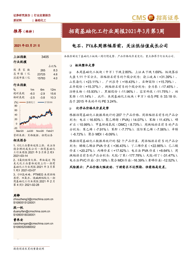 【海通证券】【20210321】招商基础化工行业周报2021年3月第3周:电石、PVA本周涨幅居前,关注低估值成长公司-25页