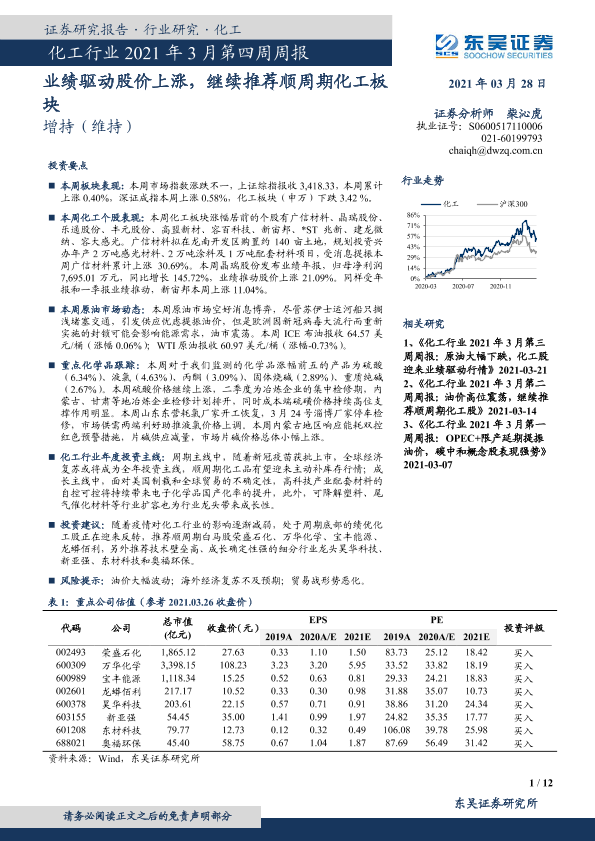 【东吴证券】【20210328】化工行业2021年3月第四周周报:业绩驱动股价上涨,继续推荐顺周期化工板块-12页