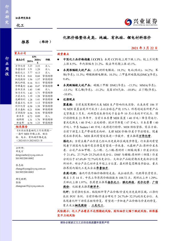 【兴业证券】【20210322】20210322-兴业证券-化工行业周报:化肥价格整体走高,纯碱、有机硅、锂电材料涨价-40页