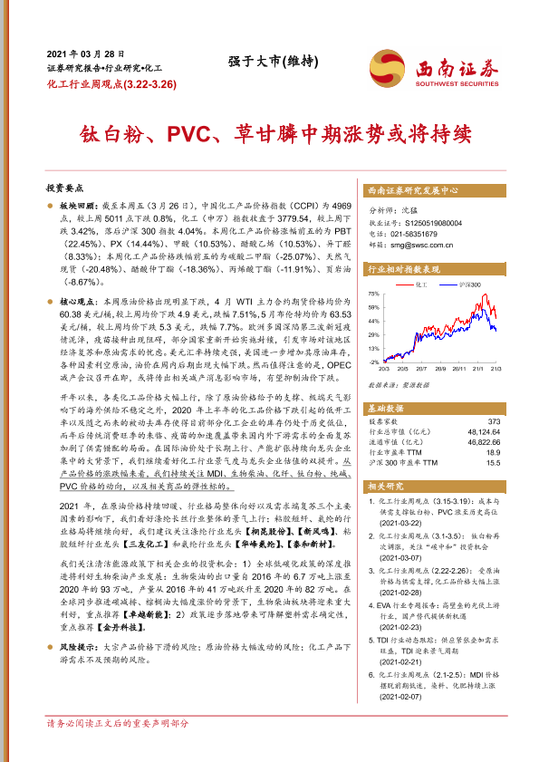 【西南证券】【20210328】20210328-西南证券-化工行业周观点:钛白粉、PVC、草甘膦中期涨势或将持续-13页