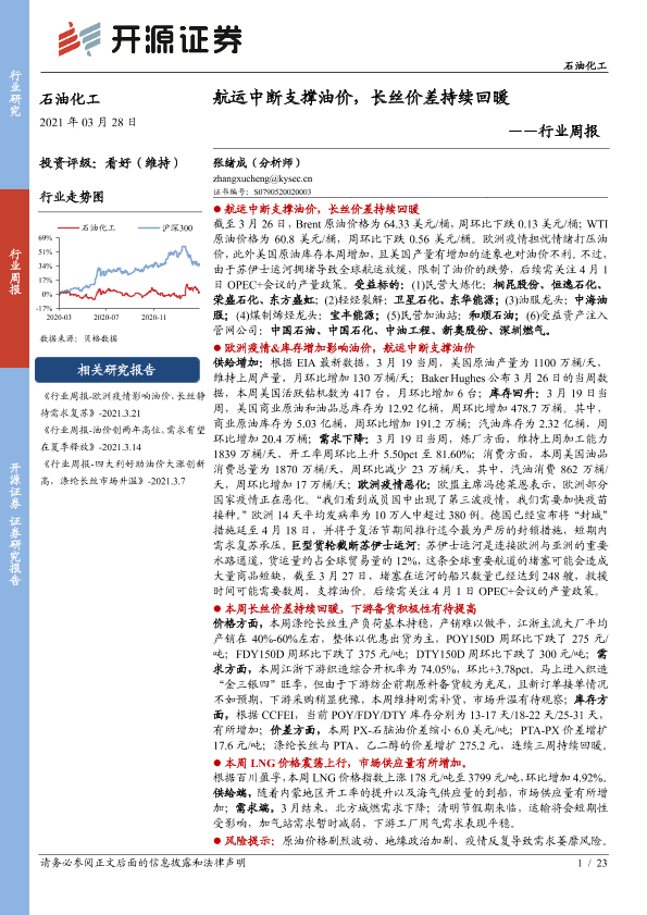 【开源证券】【20210328】石油化工行业周报:航运中断支撑油价,长丝价差持续回暖-23页