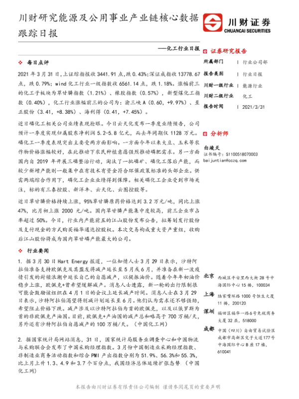 【川财证券】【20210331】化工行业日报:川财研究能源及公用事业产业链核心数据跟踪日报-4页