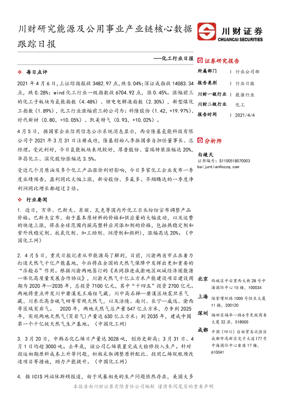 【川财证券】【20210404】化工行业日报:川财研究能源及公用事业产业链核心数据跟踪日报-4页
