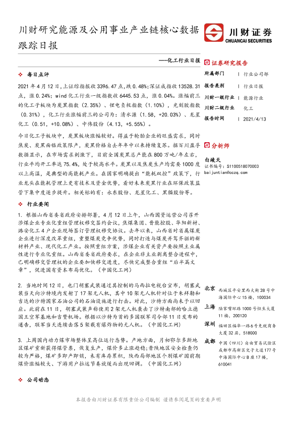 【川财证券】【20210413】化工行业日报:川财研究能源及公用事业产业链核心数据跟踪-4页