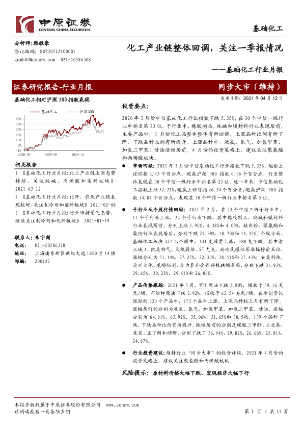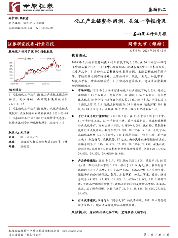 【中原证券】【20210412】基础化工行业月报:化工产业链整体回调,关注一季报情况-14页