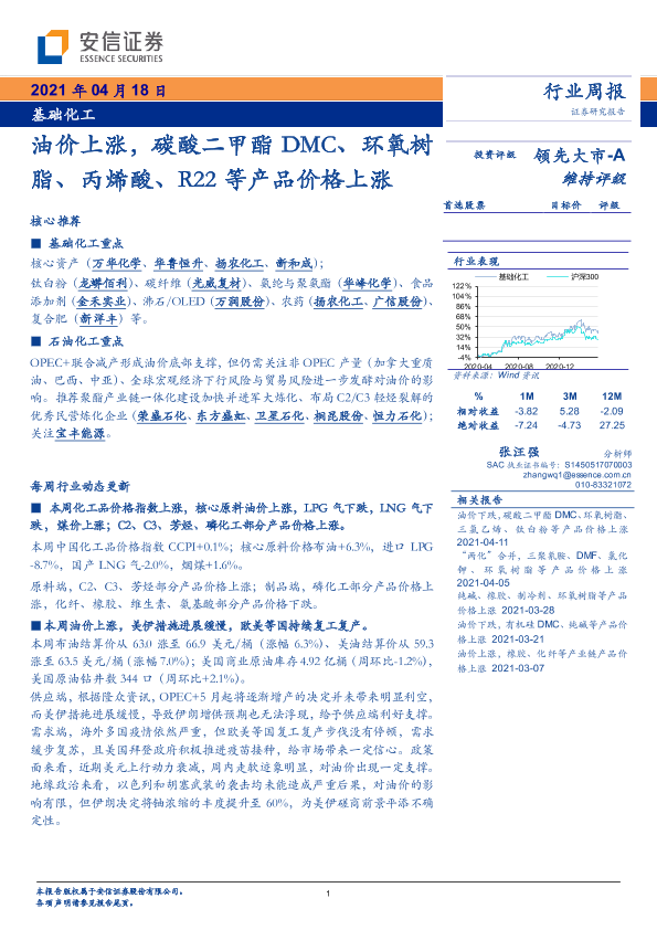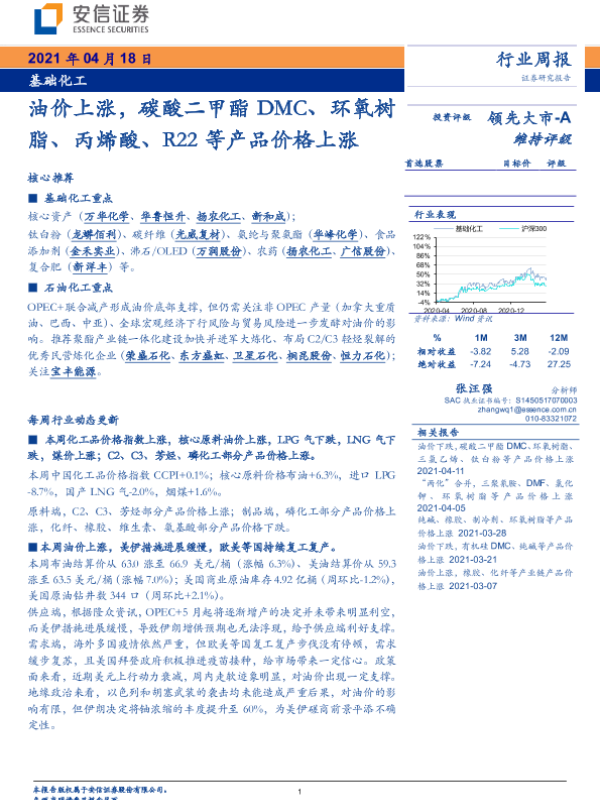 【安信证券】【20210418】基础化工行业:油价上涨,碳酸二甲酯DMC、环氧树脂、丙烯酸、R22等产品价格上涨-4页