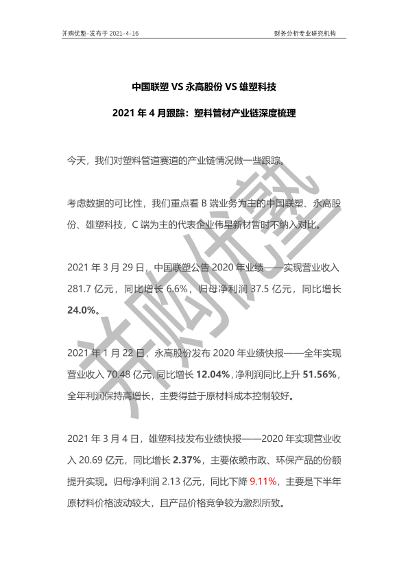 【并购优塾】【20210416】中国联塑VS永高股份VS雄塑科技:2021年4月跟踪:塑料管材产业链深度梳理-22页