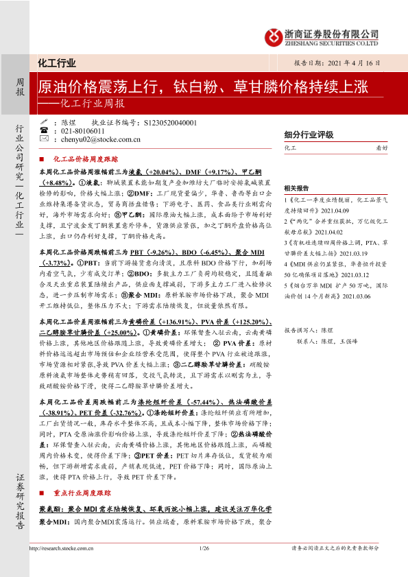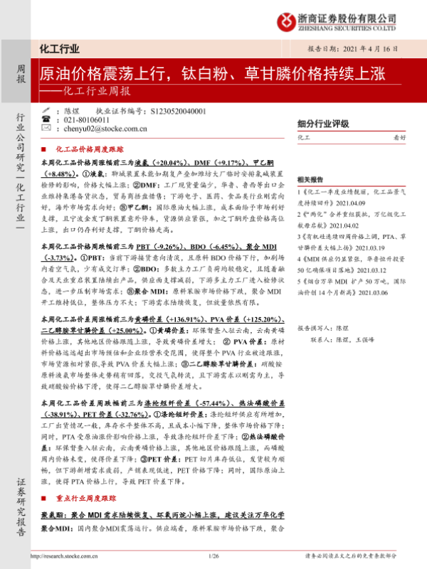 【浙商证券】【20210416】20210416-浙商证券-化工行业周报:原油价格震荡上行,钛白粉、草甘膦价格持续上涨-26页