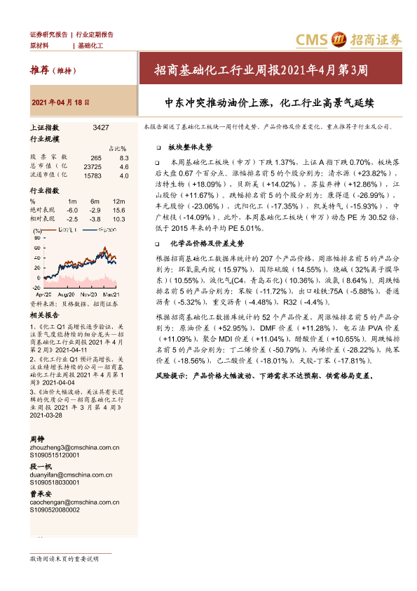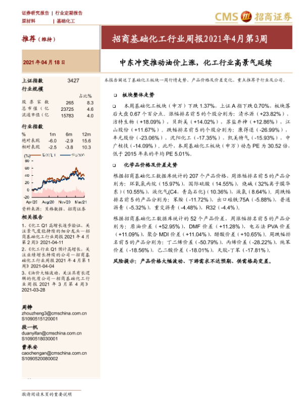 【海通证券】【20210418】招商基础化工行业周报2021年4月第3周:中东冲突推动油价上涨,化工行业高景气延续-26页
