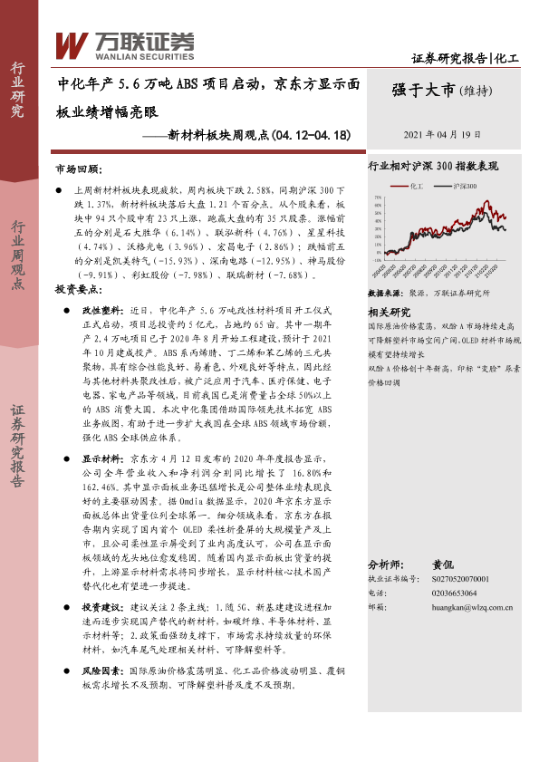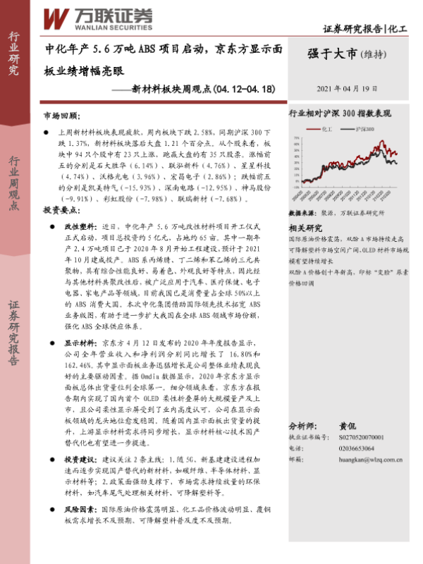 【万联证券】【20210419】20210419-万联证券-新材料板块周观点:中化年产5.6万吨ABS项目启动,京东方显示面板业绩增幅亮眼-9页