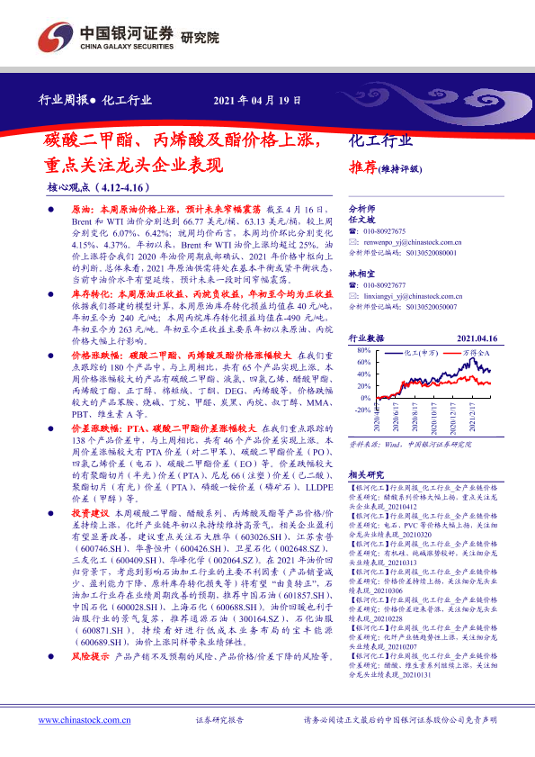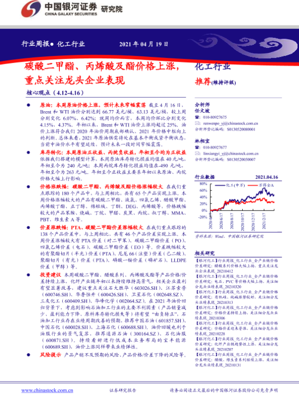 【银河证券】【20210419】20210419-中国银河-化工行业周报:碳酸二甲酯、丙烯酸及酯价格上涨,重点关注龙头企业表现-17页