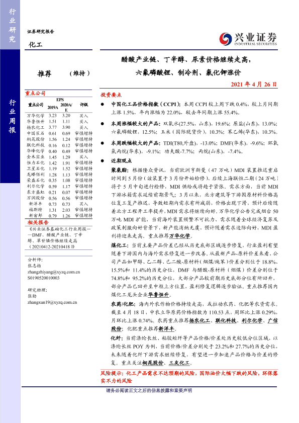 【兴业证券】【20210426】20210426-兴业证券-化工行业周报:醋酸产业链、丁辛醇、尿素价格继续走高,六氟磷酸锂、制冷剂、氯化钾涨价-40页