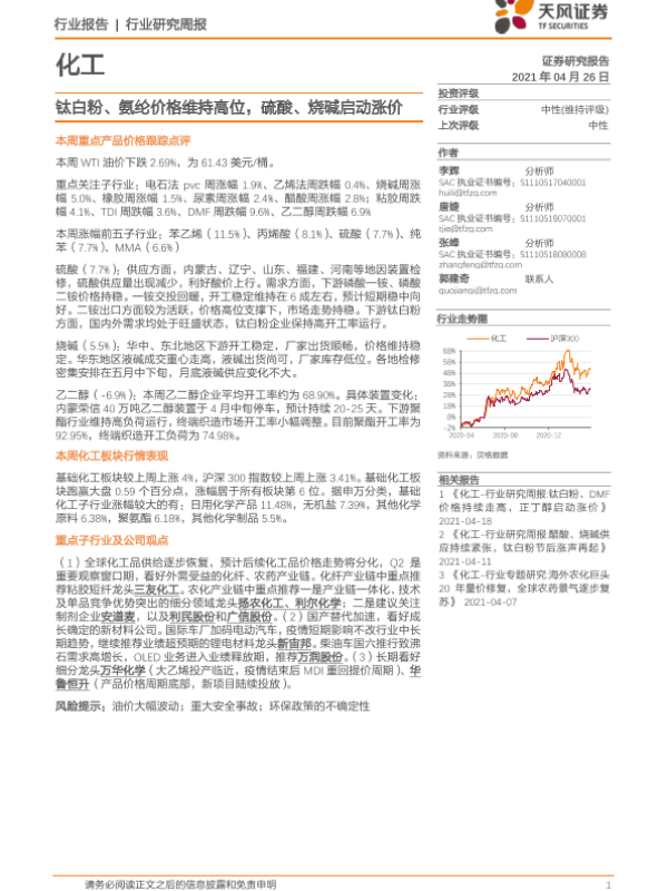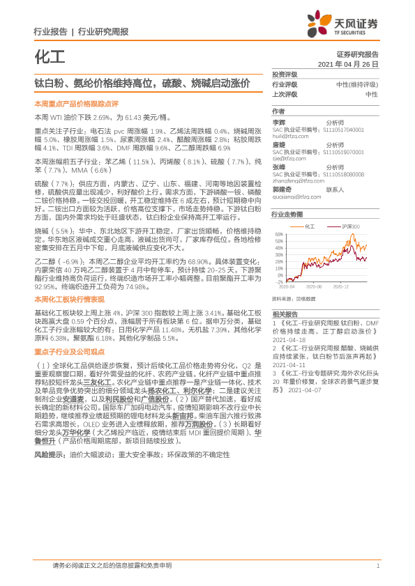 【天风证券】【20210426】20210426-天风证券-化工行业研究周报:钛白粉、氨纶价格维持高位,硫酸、烧碱启动涨价-21页