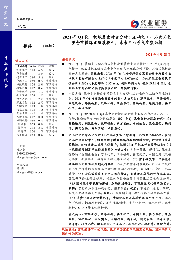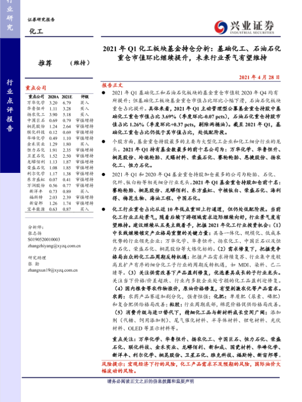 【兴业证券】【20210428】2021年Q1化工板块基金持仓分析:基础化工、石油石化重仓市值环比继续提升,未来行业景气有望维持-8页