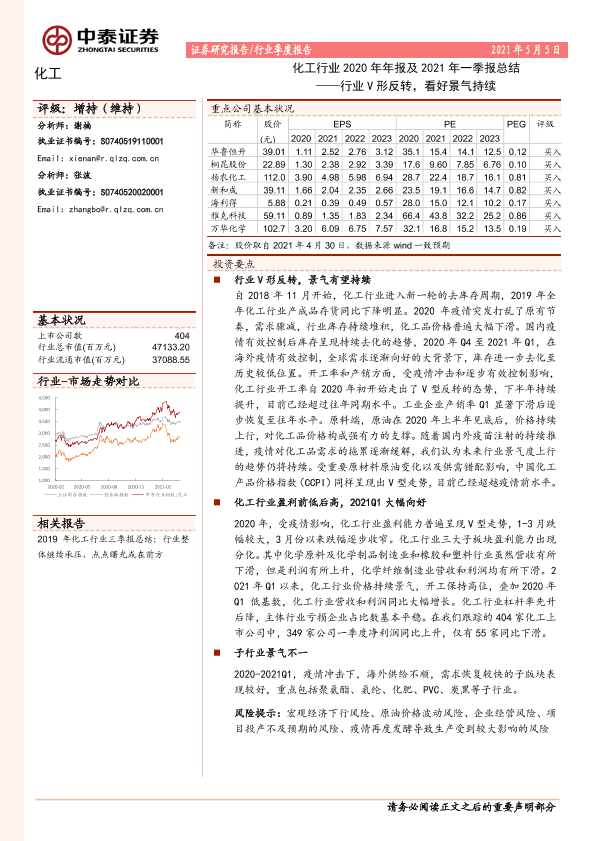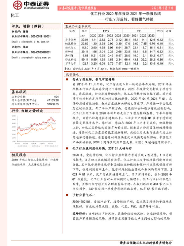 【中泰证券】【20210505】化工行业2020年年报及2021年一季报总结——行业V形反转,看好景气持续-18页