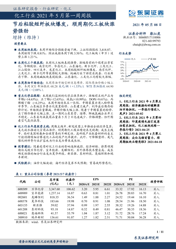 【东吴证券】【20210508】化工行业2021年5月第一周周报:节后粘胶短纤板块爆发,顺周期化工板块涨势强劲-11页