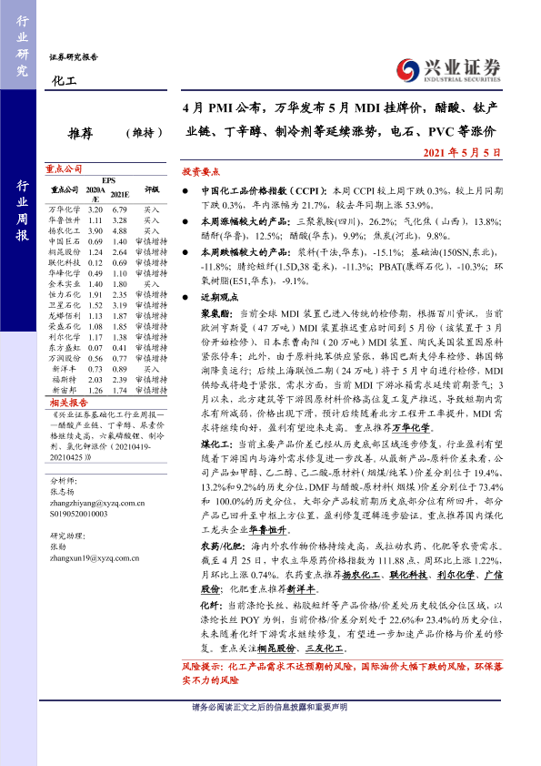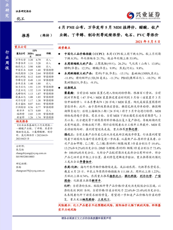【兴业证券】【20210505】4月 PMI公布,万华发布 5月 MDI挂牌价,醋酸、钛产业链、丁辛醇、制冷剂等延续涨势,电石、PVC等涨价-41页